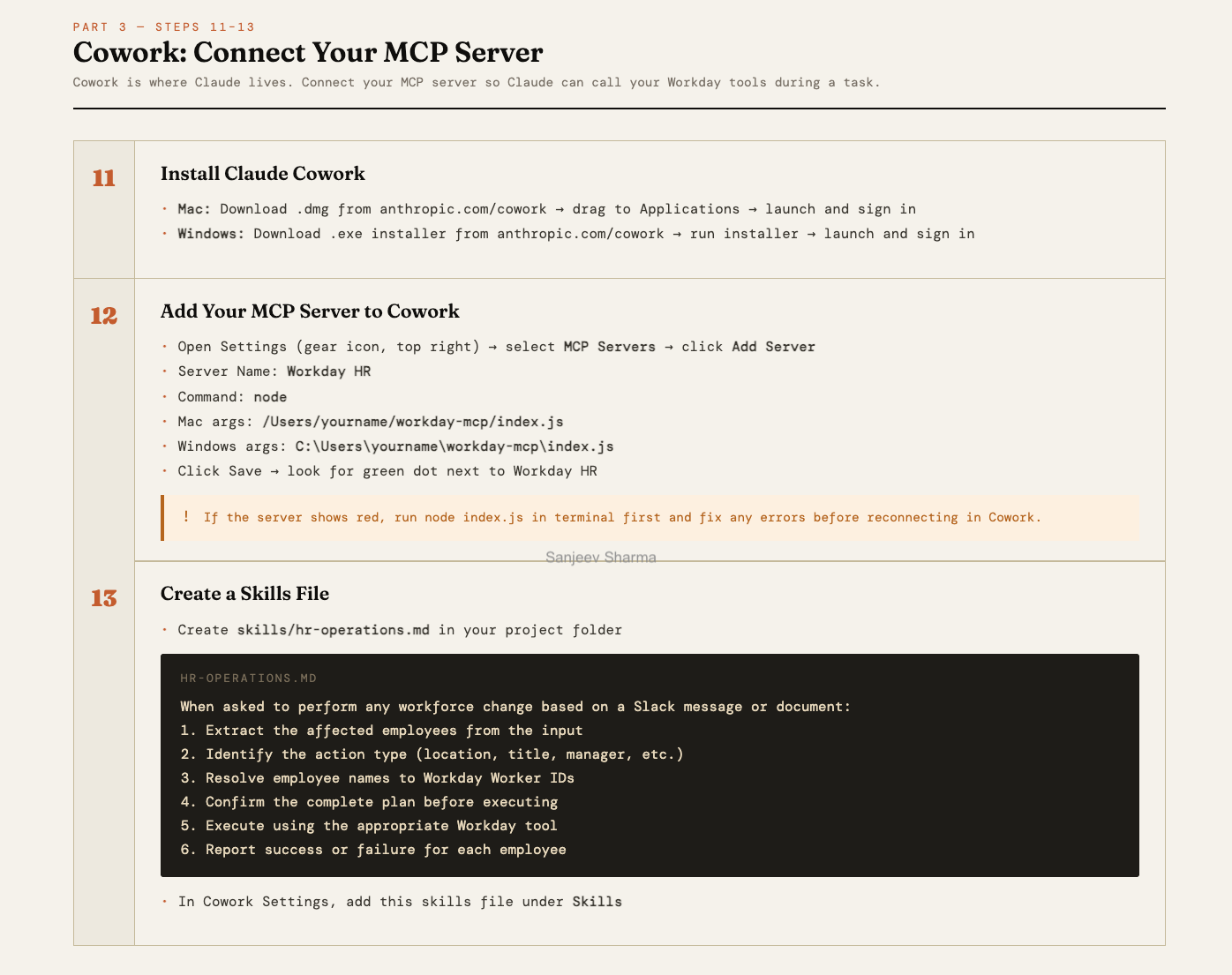 This part looks simple and mostly is. Cowork’s job in this stack is to be the orchestration layer, not the workhorse. It handles natural language intent, the confirmation gate before any Workday action executes, and the human-in-the-loop moment that keeps this from being fully autonomous. That last part is a feature, not a limitation.