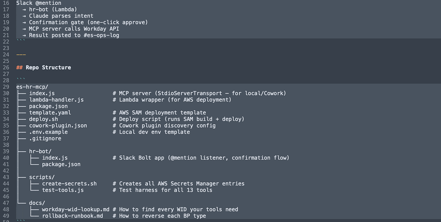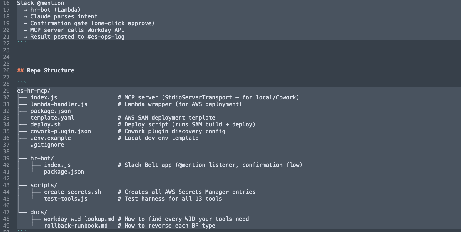 The skills file is easy to underestimate. It is not just configuration. It is the behavioral contract that tells Claude how to handle HR operation requests. The six-step sequence in that file encodes the governance logic: extract, identify, resolve, confirm, execute, report. If you want Claude to behave differently, for example requiring a second confirmation for actions above a certain employee count, that is where you put it.