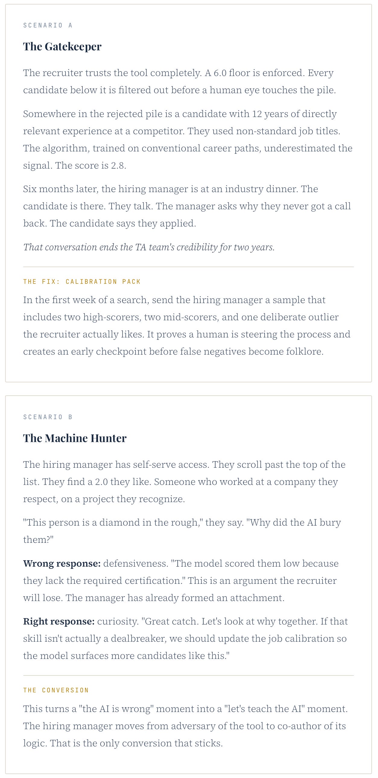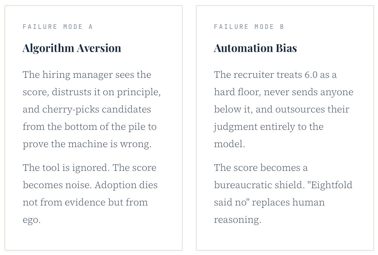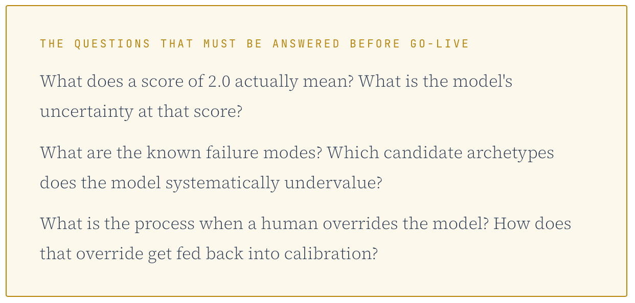 We are asking hiring managers to trust a tool they received in a 45-minute onboarding session, with no feedback loop, and no incident report when the score was wrong.