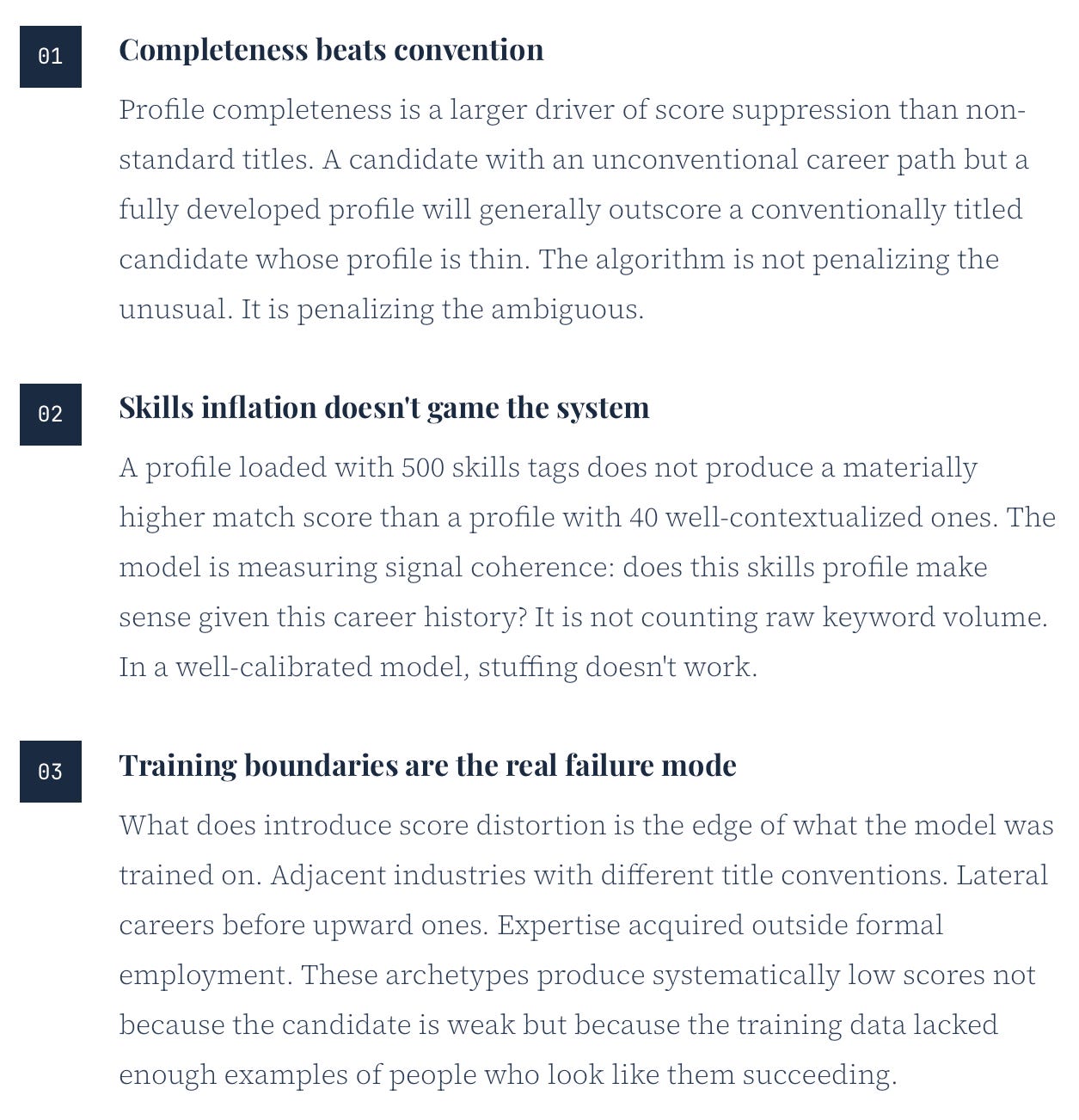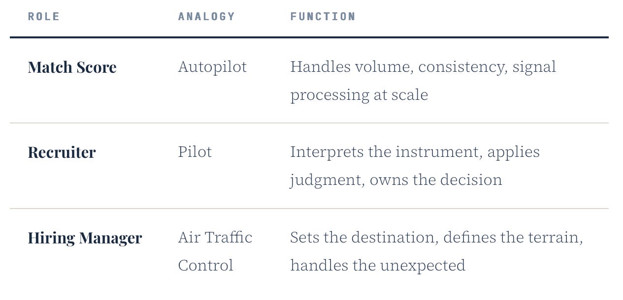 The best recruiters are not replaced by this system. They are the only ones capable of making it work. The model surfaces signal. The recruiter interprets it, contextualizes it, and takes responsibility for what happens next. That is not a reduced role. It is a more demanding one.