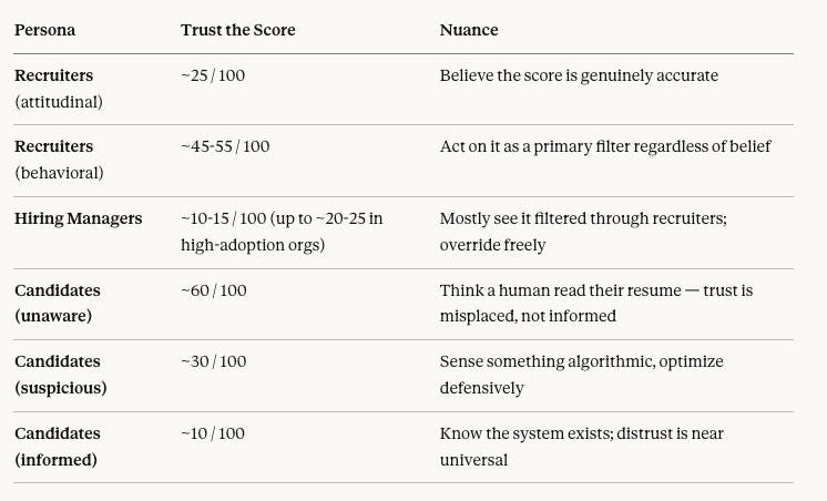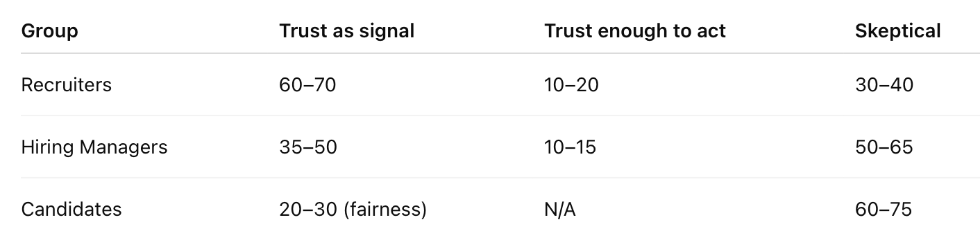 Super quick thought exercise: I was interested in prompting ChatGPT and Claude on Trust in these systems: ChatGPT broke it out by trust as a signal, trust enough to act, and skeptical, if 100 recruiters, hiring managers, and candidates believed in the score: