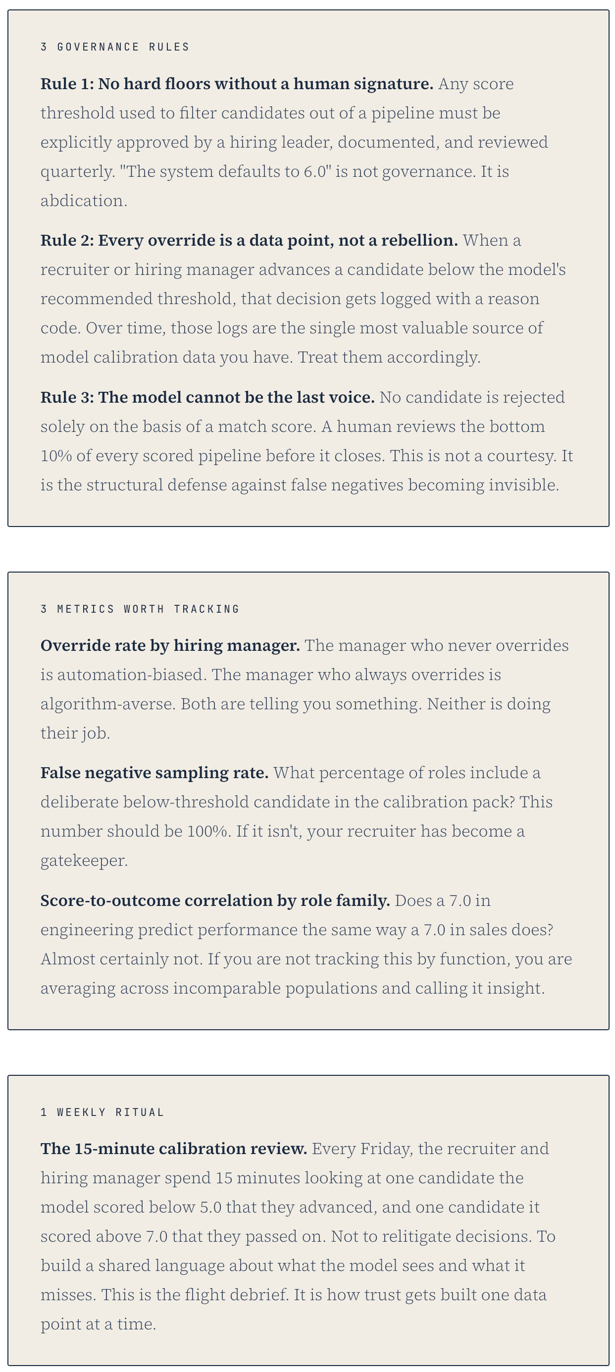 A concession worth making: in high-volume roles where thousands of applications arrive against a single requisition, some level of filtering is unavoidable. The question is not whether filtering exists. The question is whether its risks are visible, owned by a named human being, and reviewed on a regular cadence. An unexamined hard gate is abdication. A documented threshold with a quarterly human review is governance. The difference is accountability, not automation.