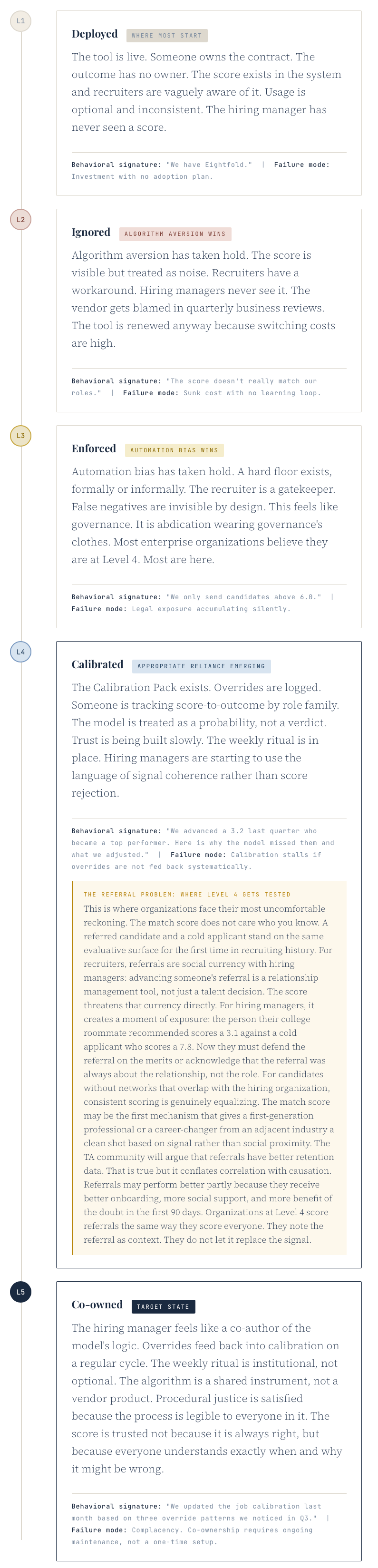 The honest diagnostic for most organizations: you are at Level 3 telling yourself you are at Level 4. The difference is not the presence of a score. It is whether a human being has ever been held accountable for what happens when the score was wrong.