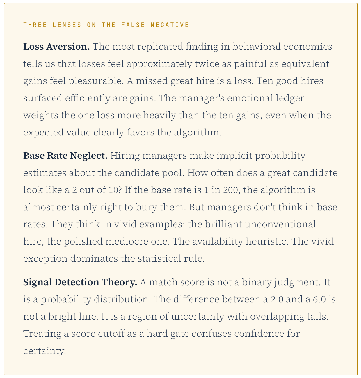 The hiring manager is not afraid of the 1,000 resumes the algorithm ranked. They are afraid of the one resume the algorithm buried. The “2 out of 10” who would have been the best hire they ever made. This fear is not irrational. It has mathematical structure.